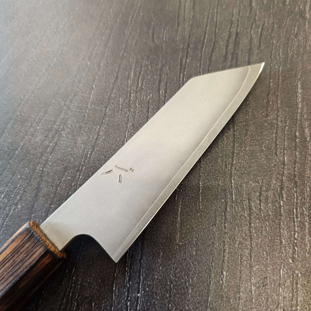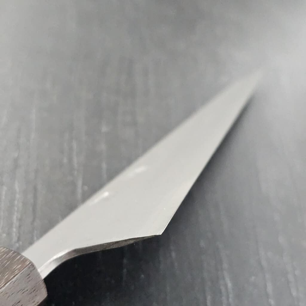 Kniven slibes færdig på forskellige vådslibesten, og æggen poleres til perfektion på læder. Skarpheden testes nøje på avispapir og tomater, mens en gulerod afslører bladets geometri og tykkelse – afgørende for knivens ydeevne og holdbarhed.