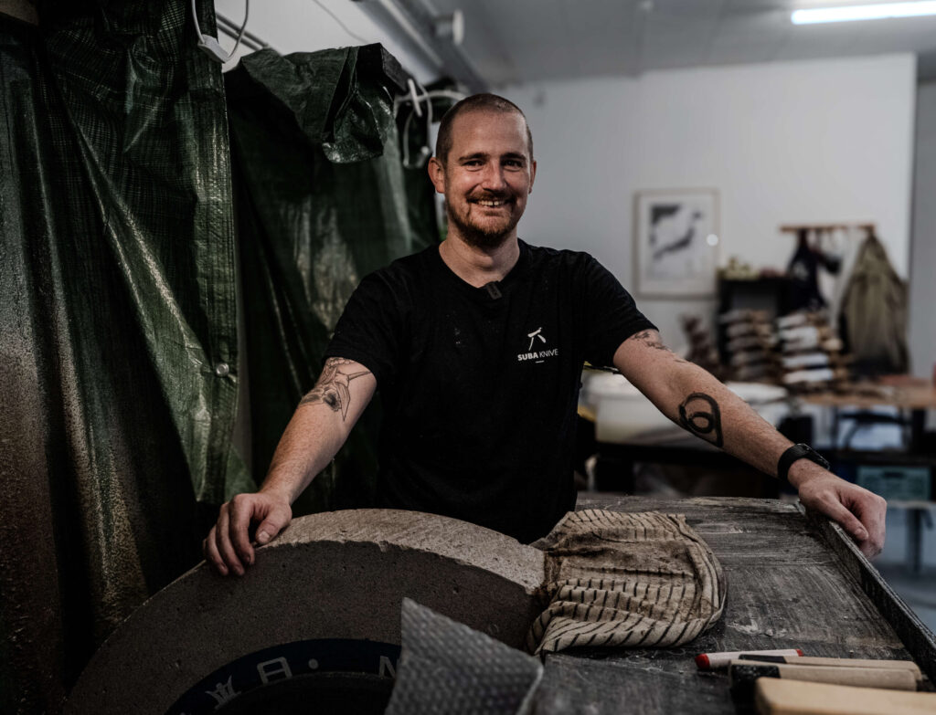I 2017 synes jeg, at jeg var nået til et punkt hvor det var tid til at få beskidte fingre, og jeg valgte derfor at trække teltpælene op, kramme familien farvel og flytte til Osaka, Japan. Mit mål var at lære det stolte håndværk indenfor Japansk knivslibning fra de bedste i branchen. Jeg er én af blot tre ikke-japanere i verden til at have gennemgået uddannelsen som sliber i Japan, og det blev startskuddet til min rejse med Suba Knives.