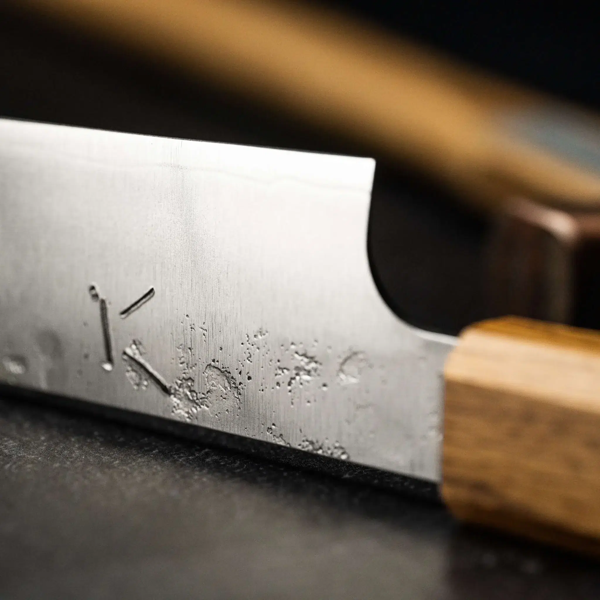 Knivmager: Keiichi Fujii, 3. generations knivsliber fra Sakai. Der laver knive under navnet “Sakai Kanechika” En meget sympatisk og hårdt arbejdende mand der har lavet knive i over 50 år. Det er virkelig en fornøjelse at se en mand som ham arbejde, han kender knivene ind og ud og alt foregår med et særligt flow. Han laver knive i mange prisklasser og både single bevel og double bevel samt rustfrit og karbon.
