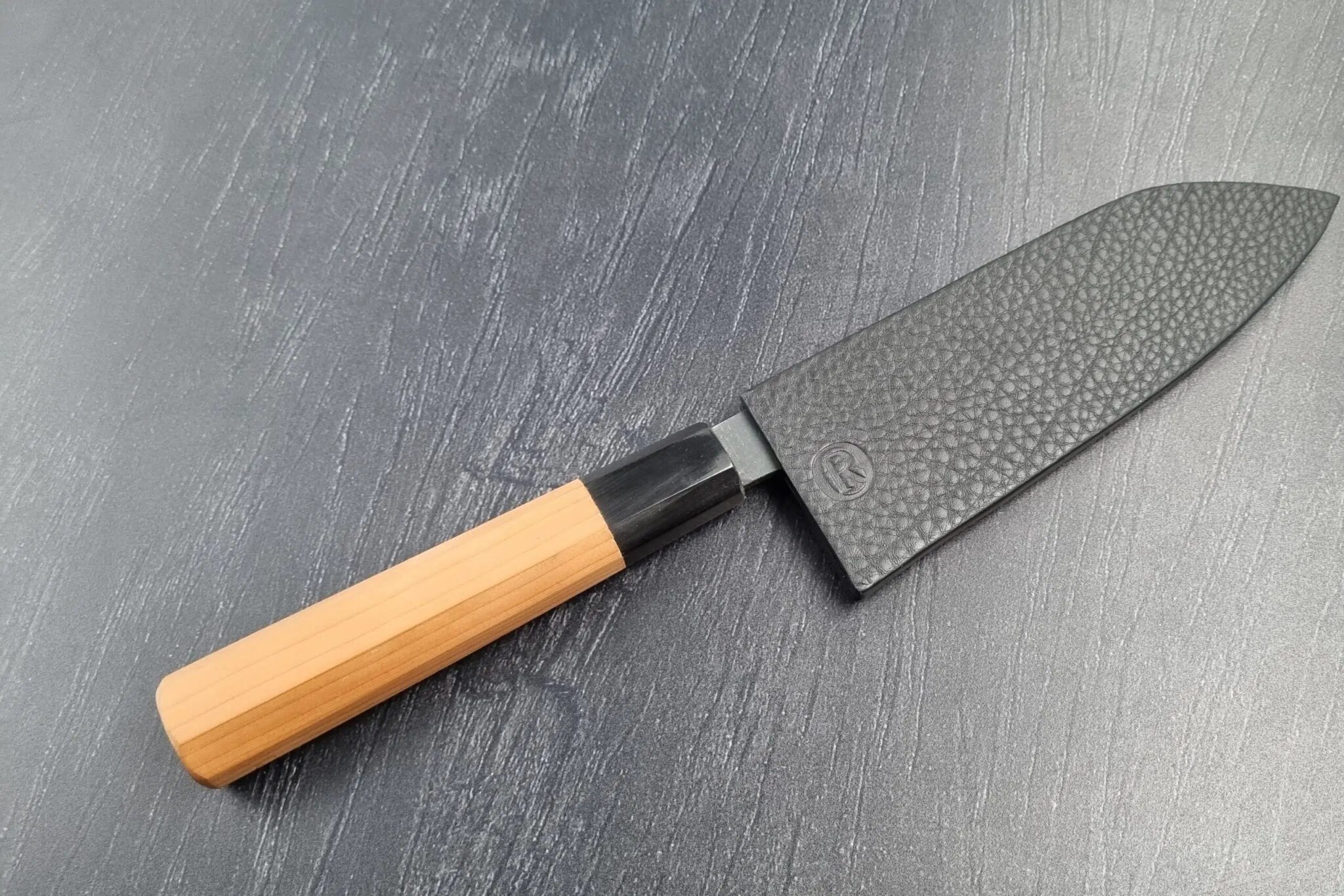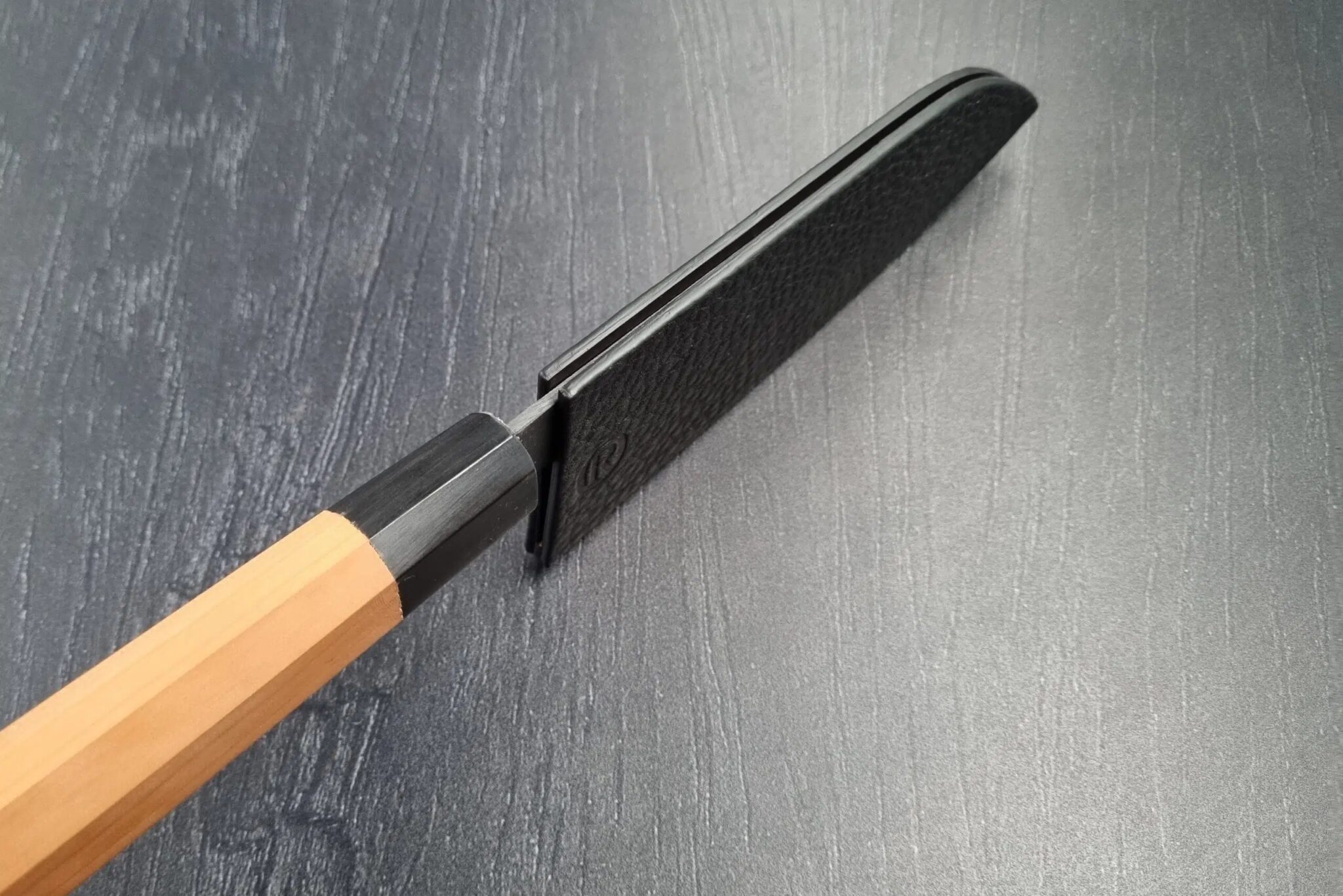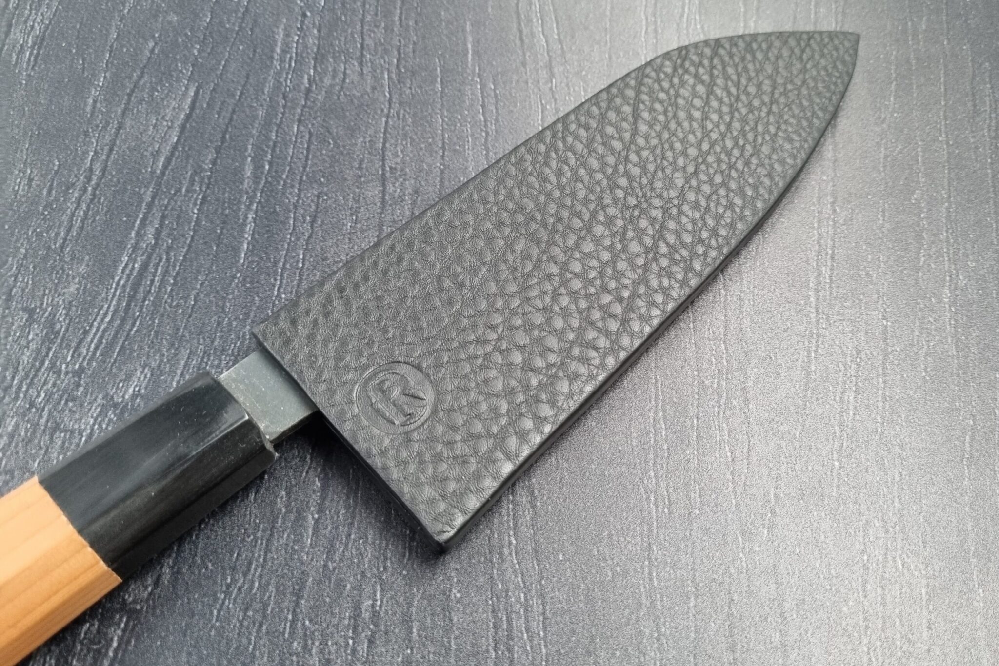 Læderskeden eller saya som man ofte omtaler skeder i knivverdenen er lavet i sortfarvet læder. Indersiden er belagt med en tynd magnet, så den lukker godt om kniven og sørger for bedst mulig beskyttelse. Der er også lagt en ekstra stribe læder i bunden hvor knivens æg skal være så du ikke skærer igennem. Fordi den har magnet indvendig, beskytter den kniven på bedste måde, samt sørger for at kniven ikke bliver ridset.
