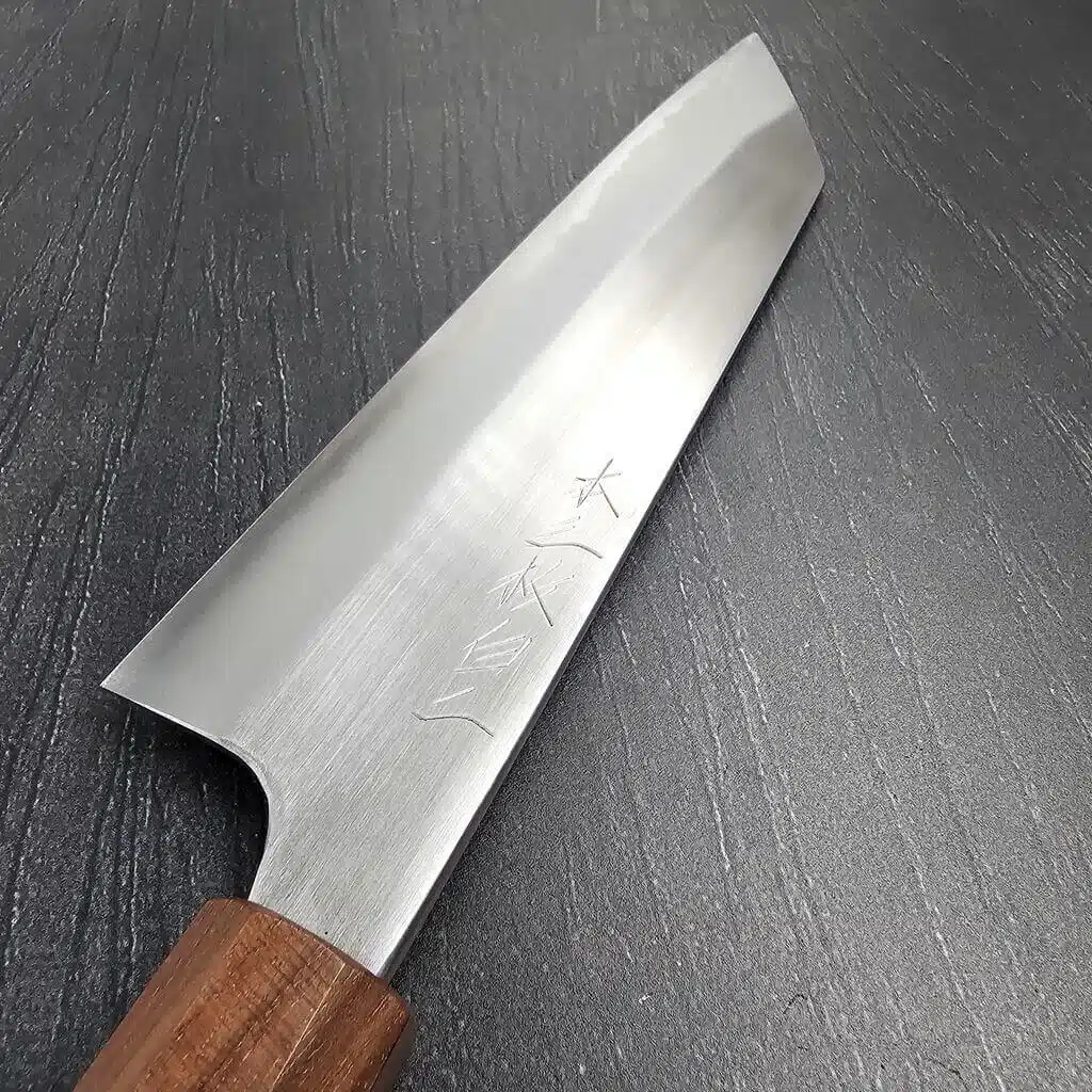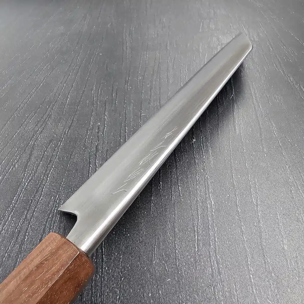 Utroligt lækker kvalitet med sans for detaljen. De er super flot tamperet, rundet i ryggen samt choil og kasumi-poleringen er super flot lavet, og overgangen fra det hårde til det bløde stål (Hagane til Jigane) fremstår super flot og “misty” Resten af kniven har kiri-migaki-finish, som jeg selv husker tilbage til med stor frustration når jeg skulle lave på værkstederne i Japan. Det er bestemt ikke nemt at gøre ordentligt og Mazaki mestre det virkeligt.