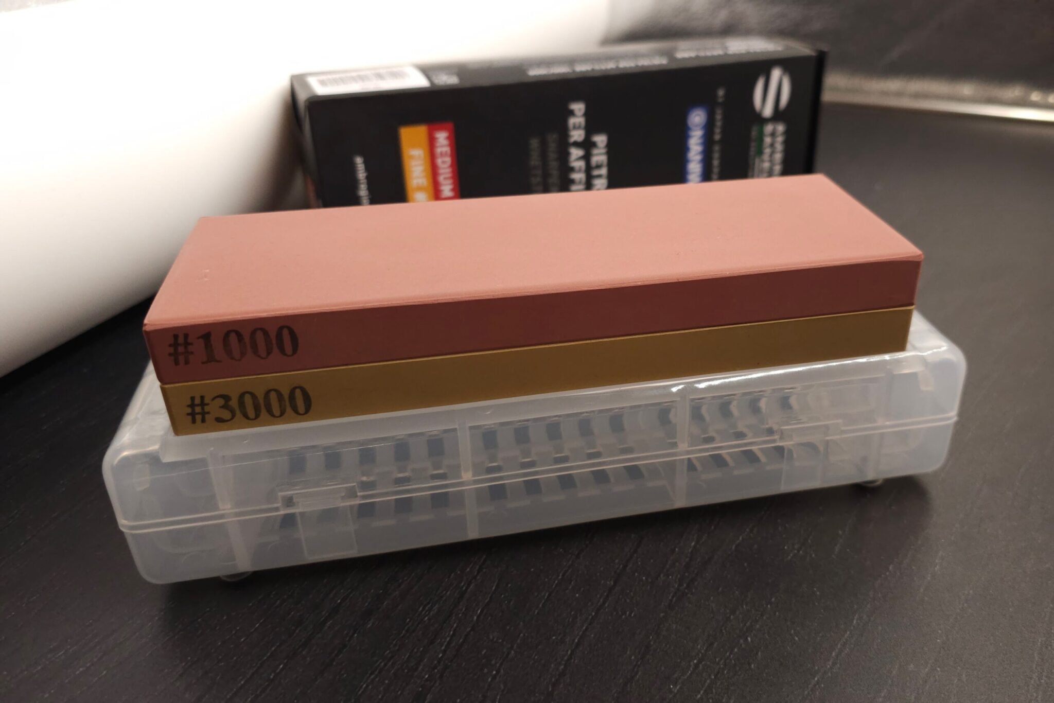 En sten som denne er hvad man kalder en kombi-sten altså en 2-sidet sten med hhv. korn 1000 som er mellem-grovhed og 3000 som er fin. Så start med side 1000 (den mørke) og slut på den lyse side bagefter.
