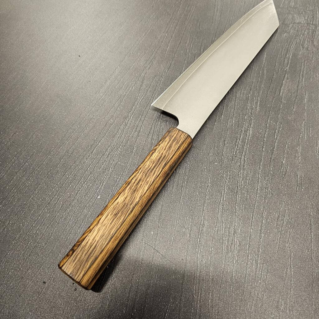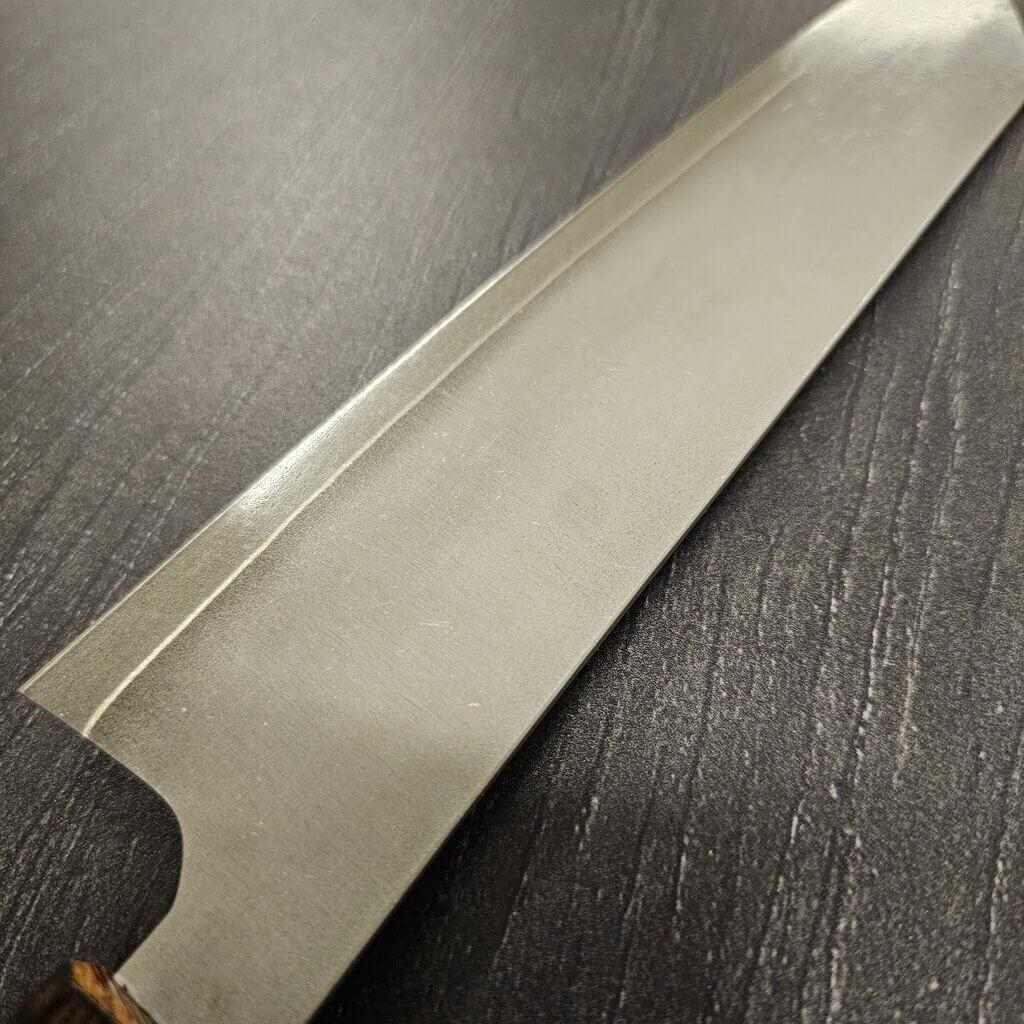 Det rustfrie Gin-3 stål er altid en stor fornøjelse at arbejde med, og heldigvis er det også et af Akihito Furukawas favoritter. Disse blade har en rustfri cladding så altså er de helt rustfrie under normale forhold. Efter råbladene er tyndet mm. afsyres de og derefter stone-wash´es de så de får et super fedt rustikt udtryk.