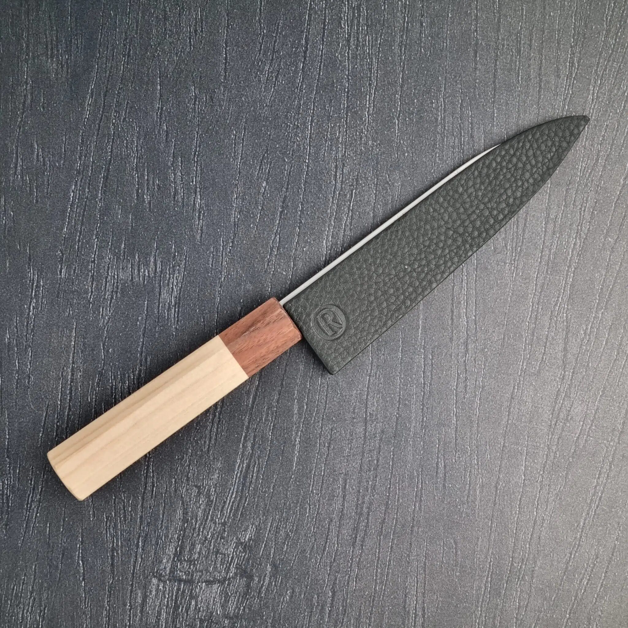 Vær opmærksom på, at vores knive er håndlavede og kan have variationer i farver hos træmaterialerne i skæfterne, og at de ikke bør bruges på hårde emner såsom frosne fødevarer og ben. Men hvis du passer godt på din kniv og undgår opvaskemaskinen, vil du nyde godt af dens utrolige præcision og skarphed i mange år fremover.
