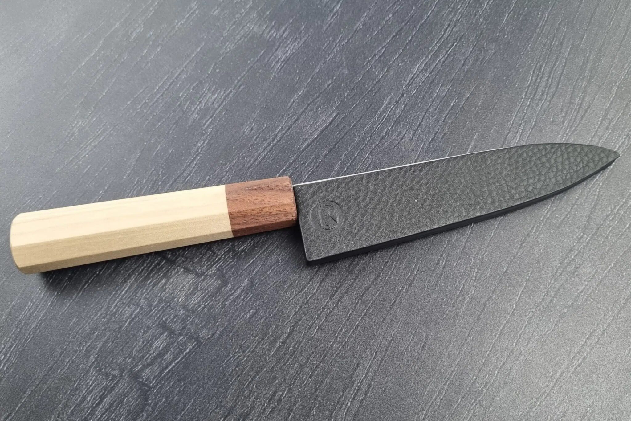Jeg har valgt et flot skæfte i brændt eg fra Fukushima til denne serie, der også underbygger den rå stil. Det passer til både højre og venstrehåndede og trods at være oktagonalt, ikke er skarpt.