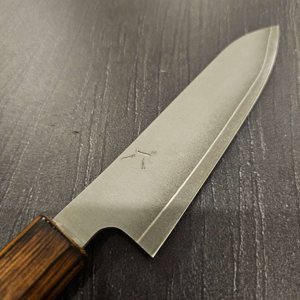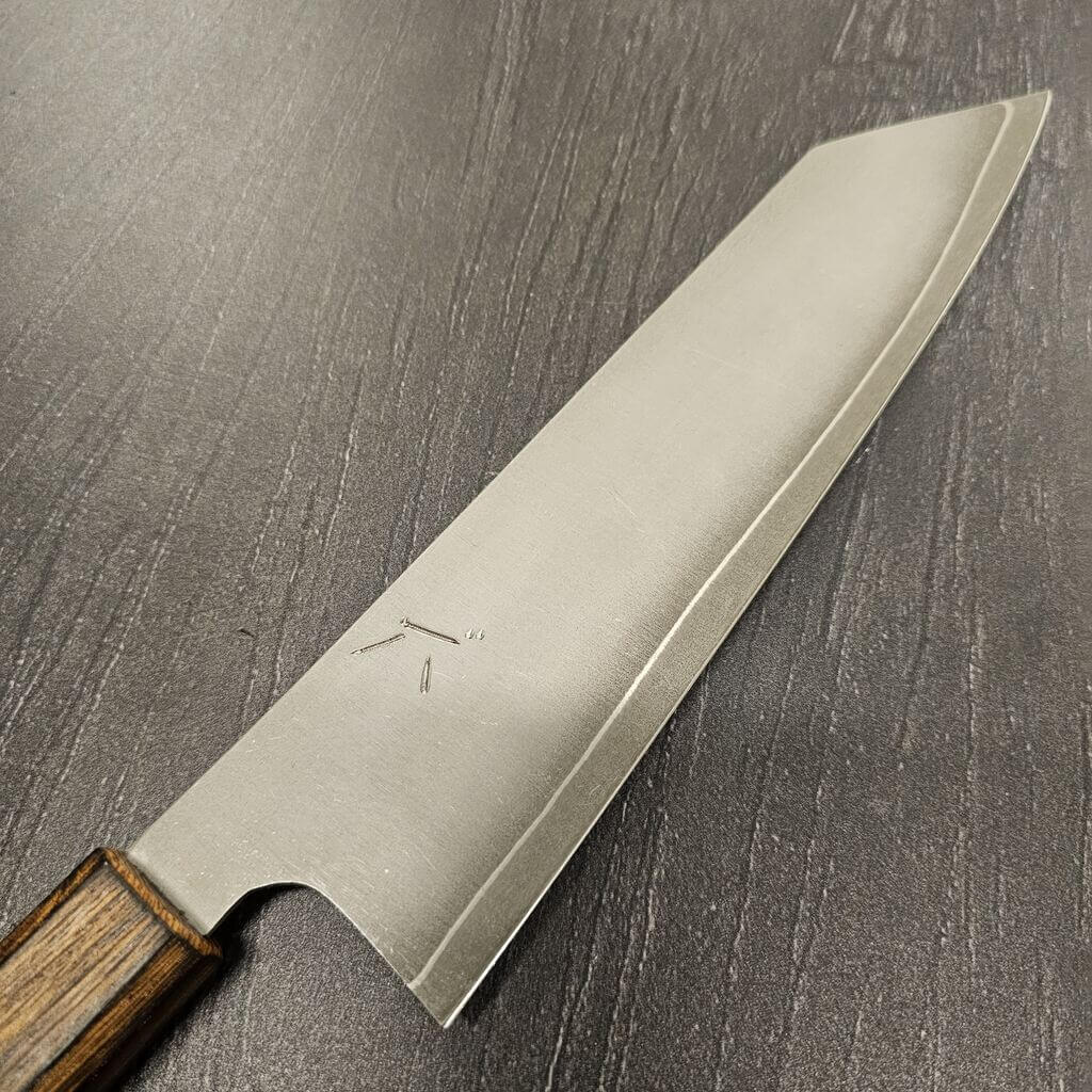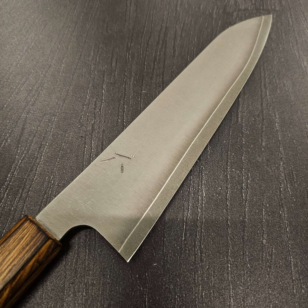 Det rustfrie Gin-3 stål er altid en stor fornøjelse at arbejde med, og heldigvis er det også et af Akihito Furukawas favoritter. Disse blade har en rustfri cladding så altså er de helt rustfrie under normale forhold. Efter råbladene er tyndet mm. afsyres de og derefter stone-wash´es de så de får et super fedt rustikt udtryk.