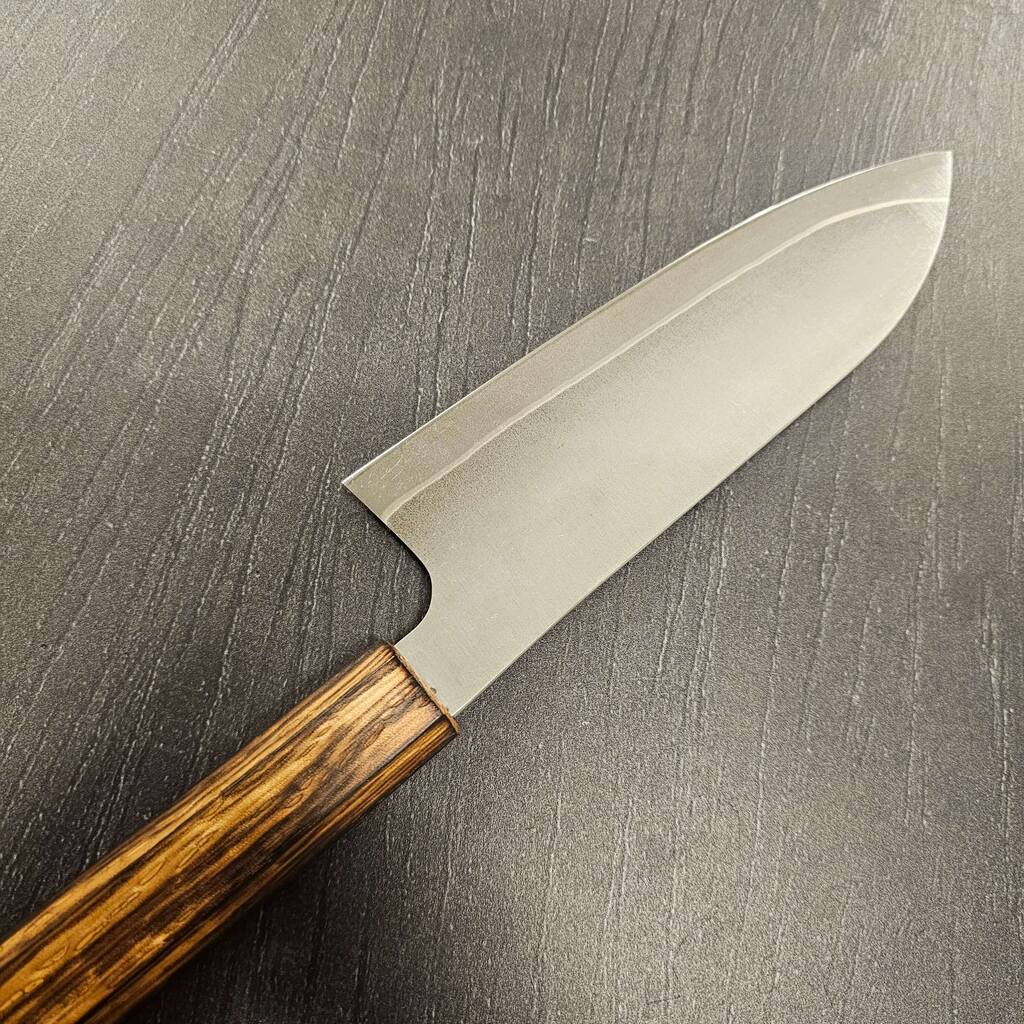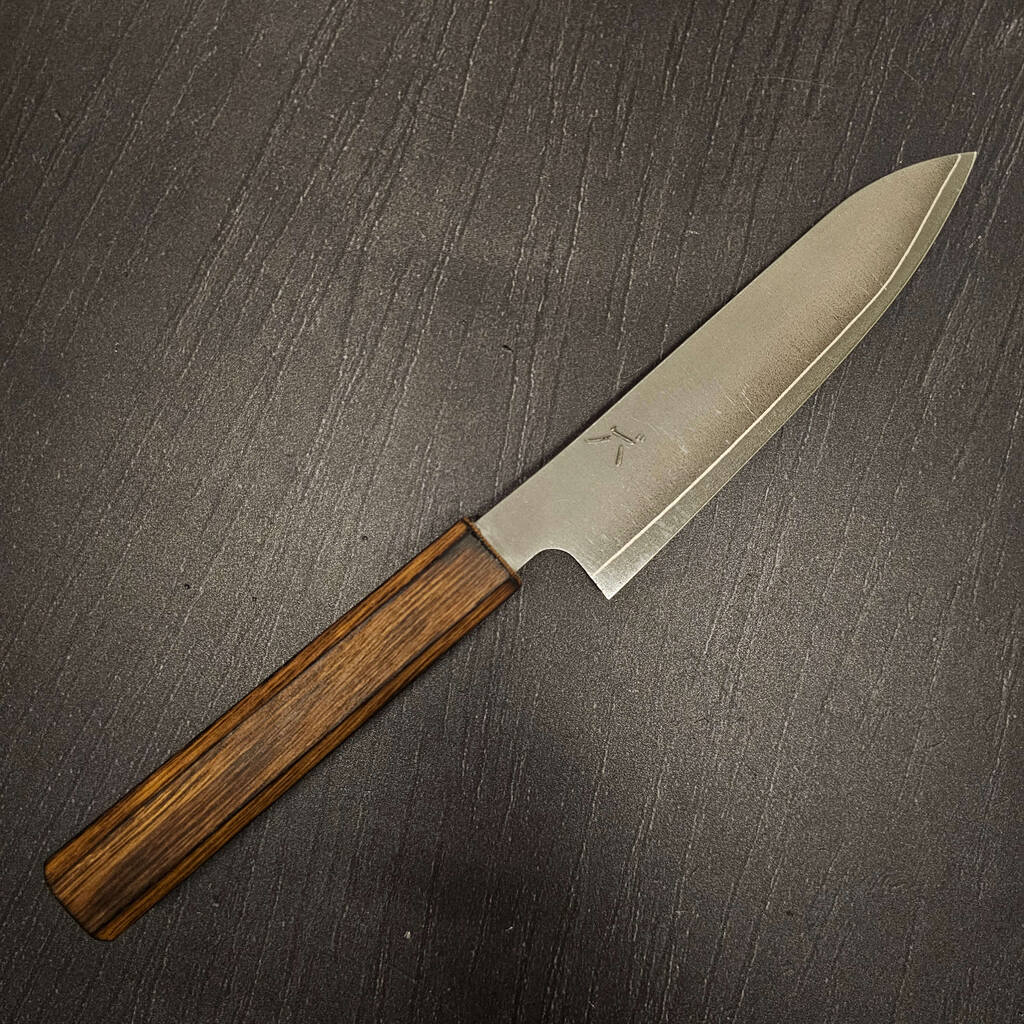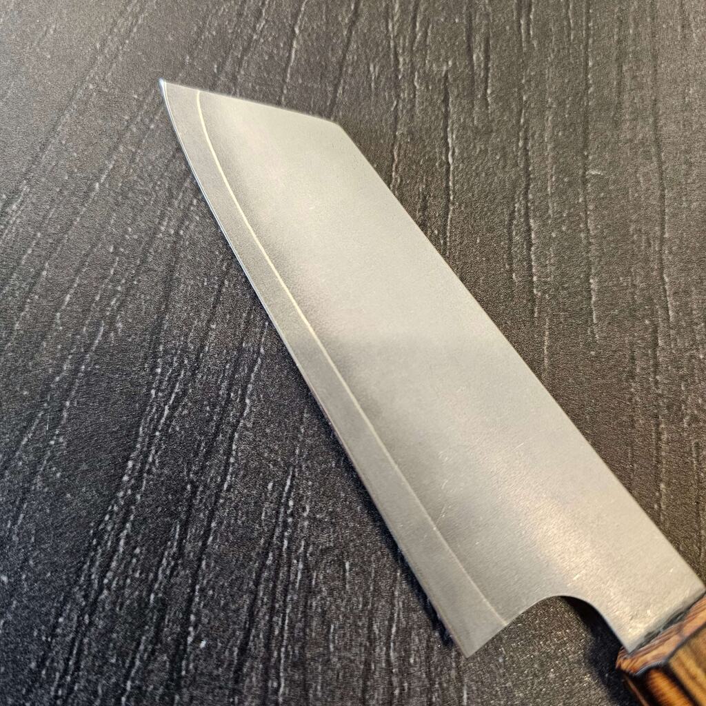 En morderne knivsform som jeg holder utroligt meget af, inspireret fra Mizusu Hamono har jeg lavet denne knivsform som jeg synes er fantastisk til mindre opgaver og trods det er en lille kniv, så får man stadig noget højde på bladet og kan køre den mod knoerne.