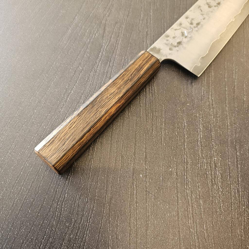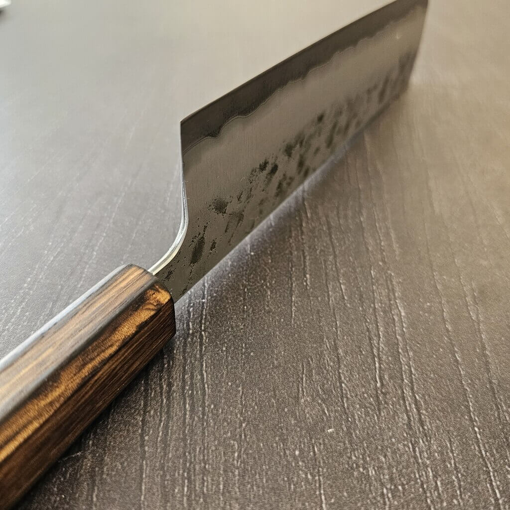 Skæfterne er lavet i Fokushima i Japan og er lavet i brændt eg også kaldet Baikoku, og jeg synes det matcher det mørke blad utroligt godt! Skæftet er 8 kantet så det passer både til højre og venstrehåndede.