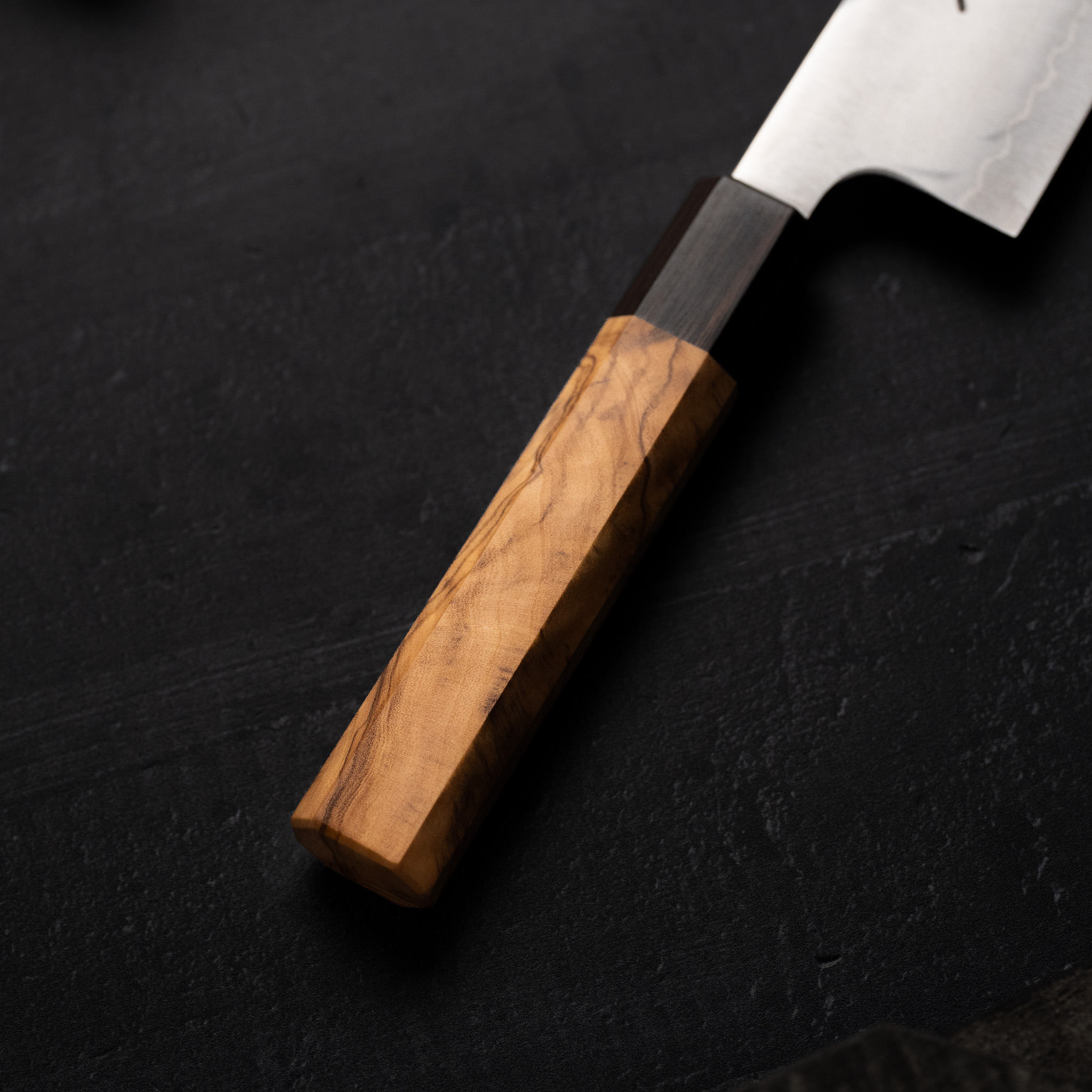 Skæftet er lavet i utroligt smukt Oliventræ og Ibenholt, og jeg synes selv det fungerer fantastisk godt til knivene. Det er oktagonalt, og fungerer både til højre og venstrehåndede. Selv med våde hænder har du et super godt greb.