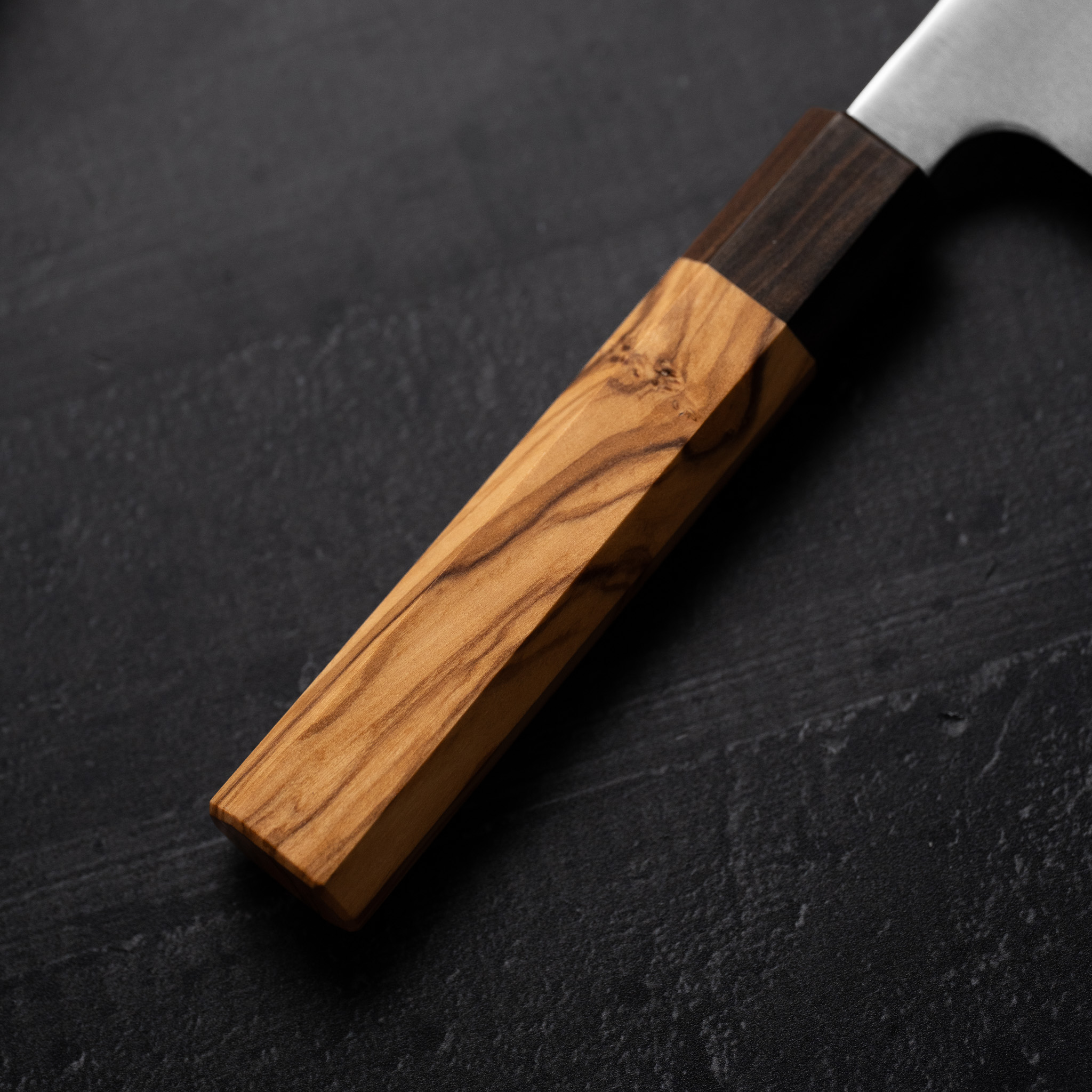 Skæftet er lavet i det utroligt smukke oliventræ og Ibenholt, og jeg synes selv det fungerer fantastisk godt til knivene. Det er oktagonalt, og fungerer både til højre og venstrehåndede. Selv med våde hænder har du et super godt greb.