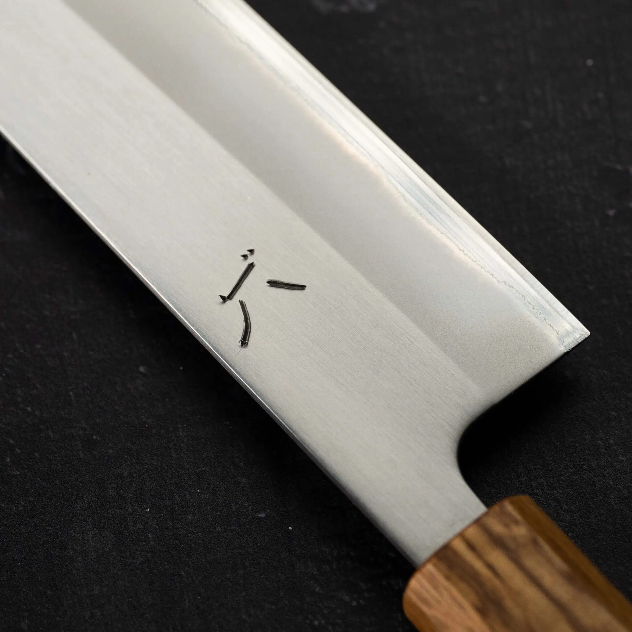Kniven er lavet af traditionelt japansk hvidt-1 / Shirogami-1 stål, som er kendt for sin renhed og enkelhed, da det primært består af jern og kulstof ca. 1,3 %. Dette gør det muligt at opnå en skarp kniv, der bevarer sin skarphed i lang tid og udvikler en smuk patina over tid.