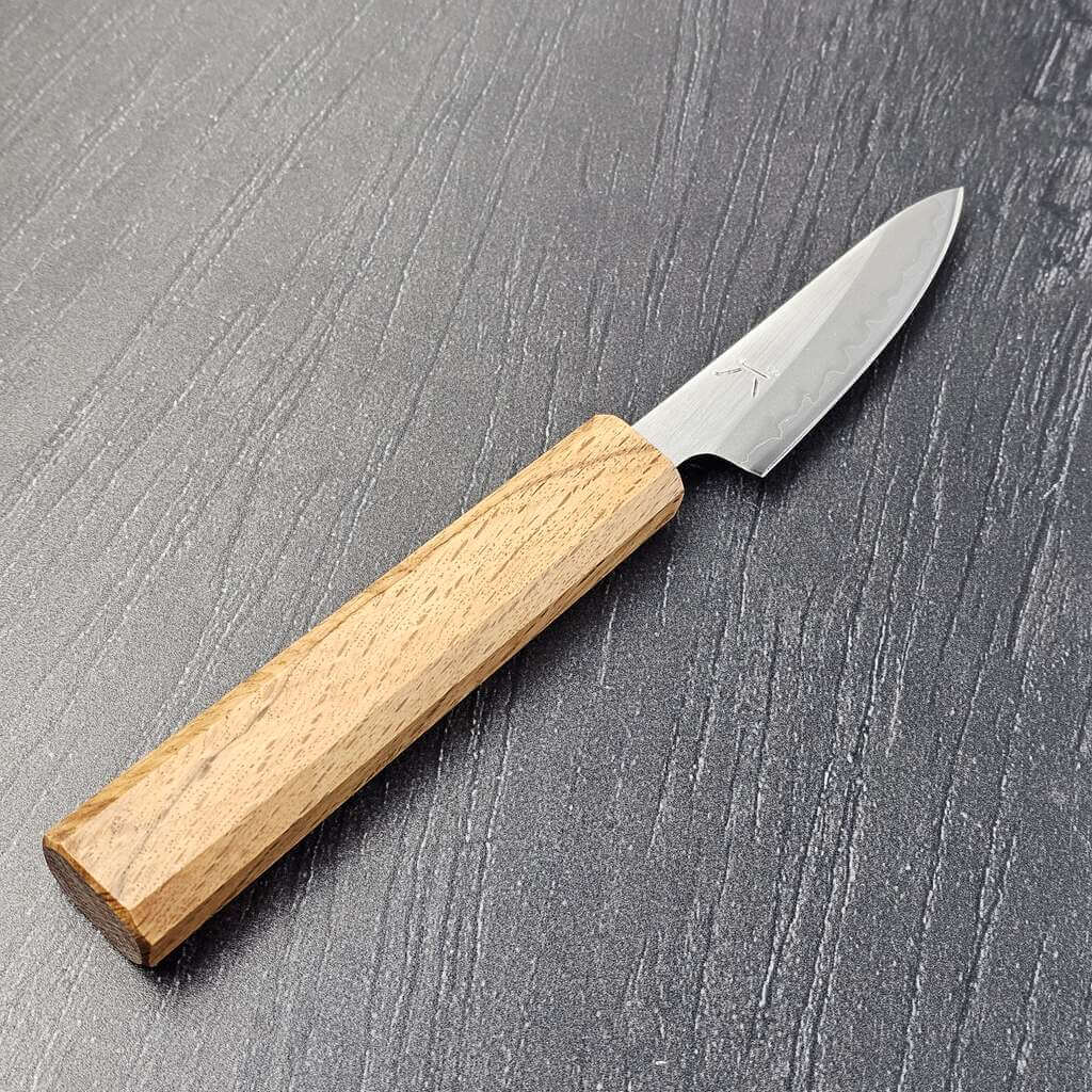 Denne kniv er fantastisk til at “arbejde i hånden”, altså hvor du ikke bruger kniven på et skærebræt, men i luften når du feks. ordner svampe, mindre grøntsager osv. Steffen har sat et flot skæfte på på 12 cm, som gør at kniven ikke “forsvinder” i hånden, men at du føler der er styr på kniven.