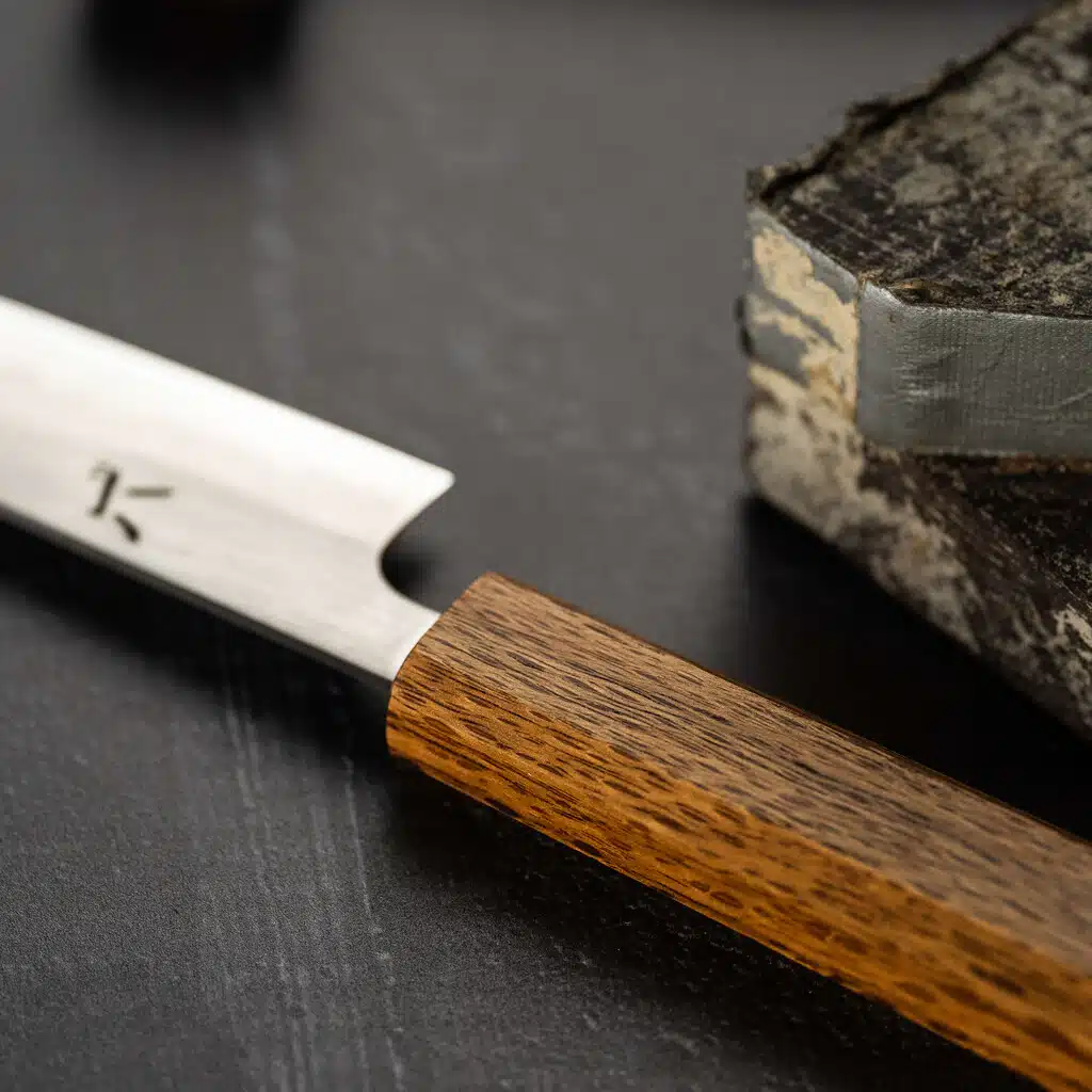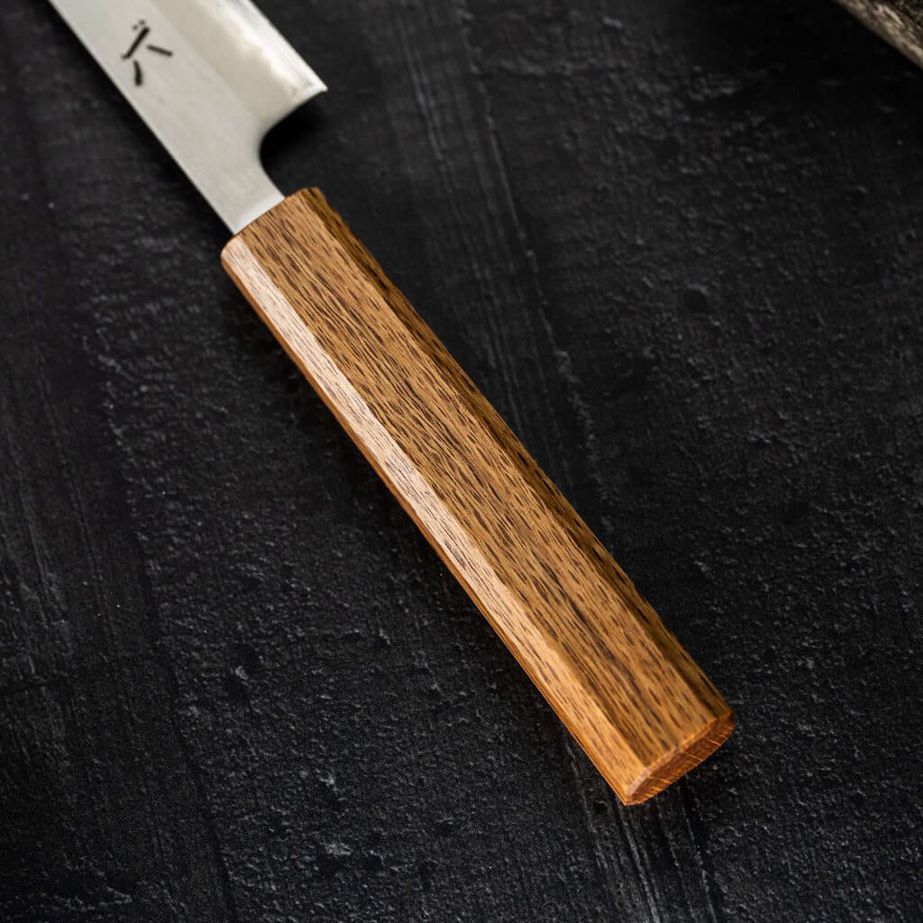 Vi er super stolte af at kunne præsentere denne kniv lavet af vores rigtig gode venner i Tosa på Shikoku-øen i Japan, en ø der udover at have en af knivbyerne også er kendt for sin legendariske pilgrimsrute. Super flot håndværk! Kniven tamper en smule fra skæftet og ud mod spidsen og er generelt virkelig flot tyndet ind.
