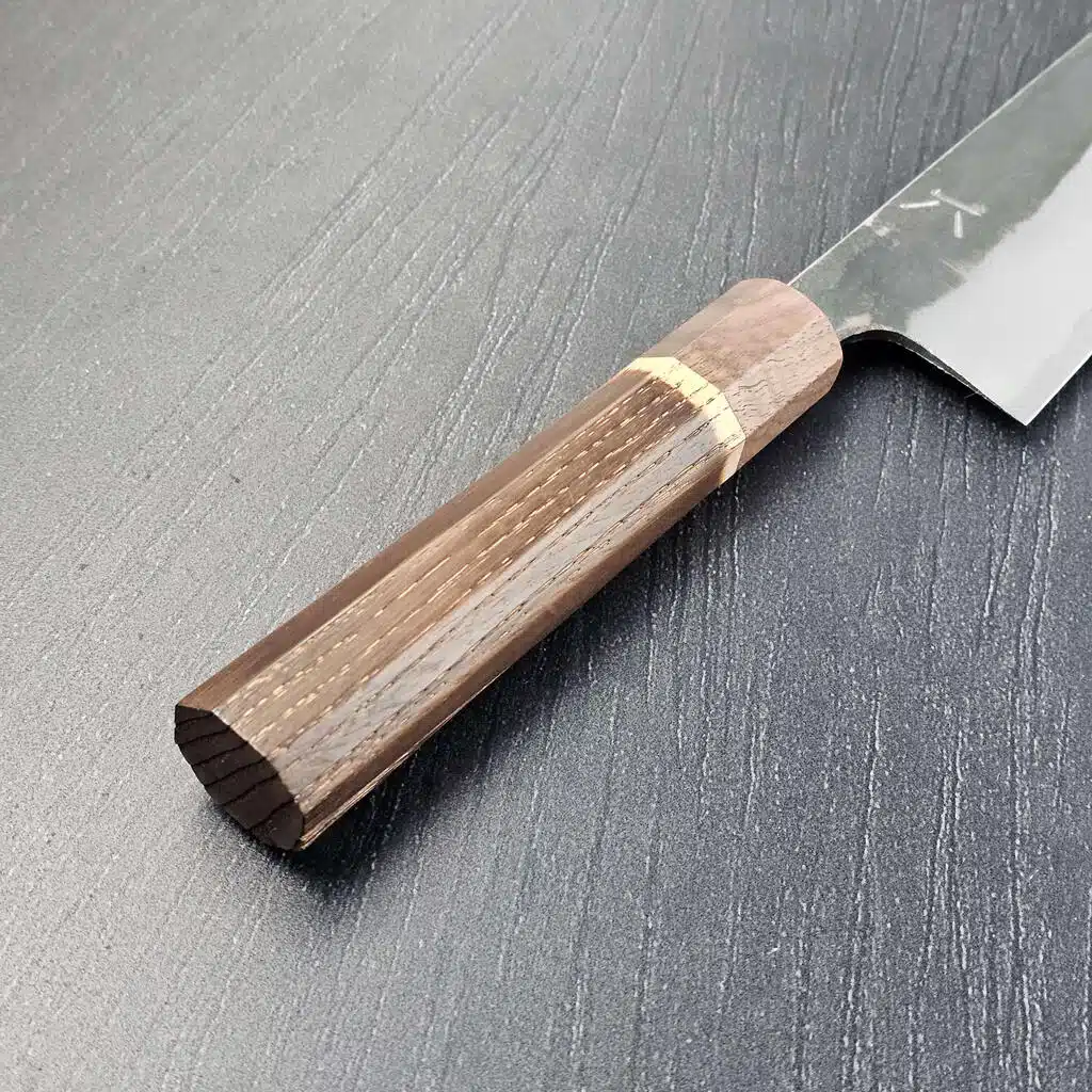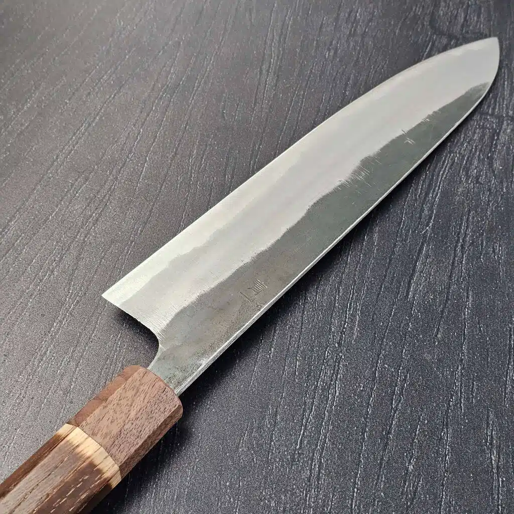 Jeg har valgt at vedligeholde den rustikke kurouchi-finish på knivens bagerste del og knivene fremstår generelt ret rå, og man kan næsten fornemme håndværket og det rå miljø de er lavet i.