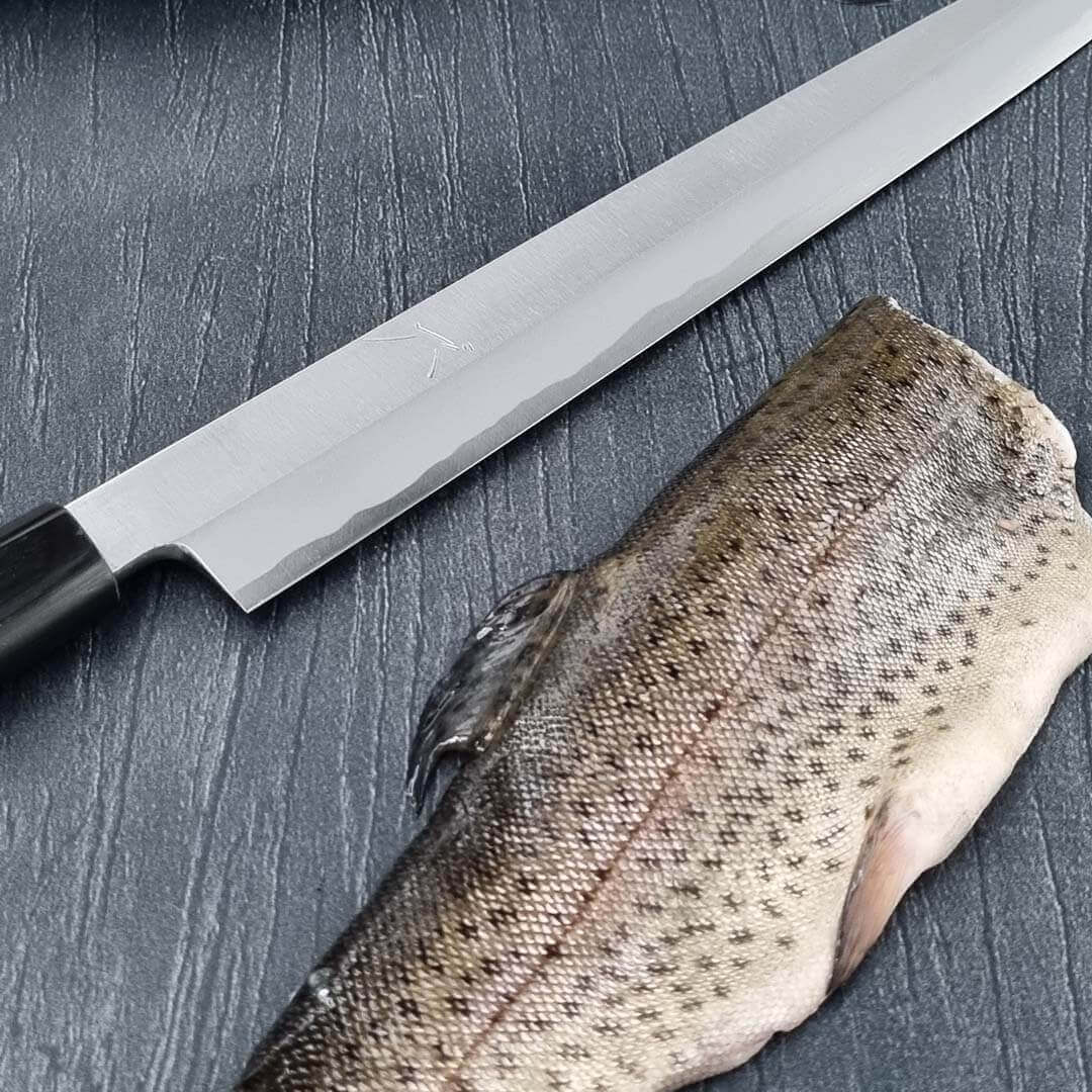 Når fisken er fileteret ud og ligger pænt på skærebrættet. Så er det yanagiba kniven du rækker ud efter for at skære den i mundrette stykker som f.eks. sashimi. Kniven er på grund af sit lange smalle blad fantastisk til at skære fileten ud. Du lægger blot hælen af kniven på fisken og trækker kniven igennem. På den måde undgår du at flosse det sarte fiskekød ved at file kniven frem og tilbage.