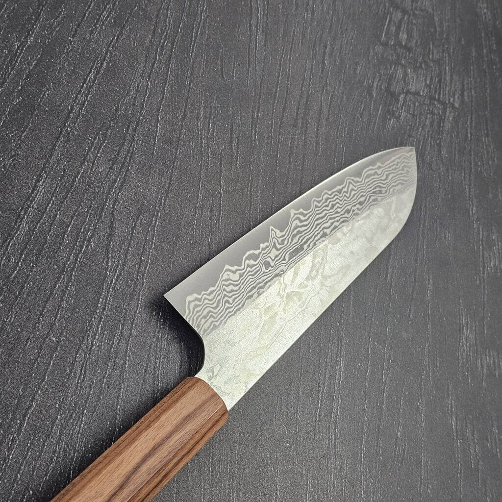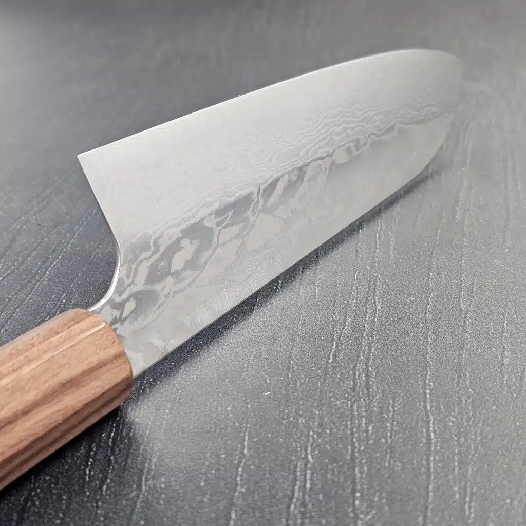 Ginsan (også kendt som Gin-3 eller Sølv #3) er et rustfrit stål med et kulstofindhold på 1% og 14% krom. Det bevarer de karakteristiske egenskaber ved japansk kulstofstål og har en hårdhed, der minder om feks. Shirogami #2, men med den fordel, at det er rustfrit. Ginsan nem at slibe og kombinerer kulstofstålets karakter med rustfri fordele, hvilket gør det til et fremragende valg for dem, der ønsker en japansk kulstofståls kniv, der er nem at vedligeholde. Alt i alt fantastisk stål der er nemt at vedligeholde og i dette tilfælde omgivet med adskellige lag blødere stål, der fremstår utroligt smukt efter jeg har tyndet ind, poleret op, glasblæst og meget mere.